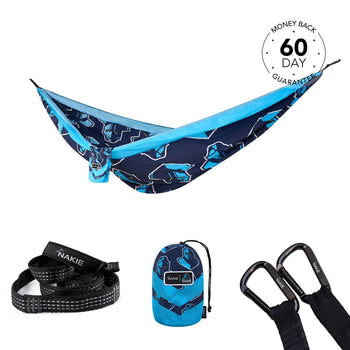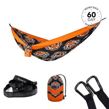 NRL Wests Tigers x Nakie Double HammockDimensions: 3m × 1.8mWeight rating: 225kgWeight: 600g 2 × Hammock StrapsLength: 2.3m per strapWeight rati...