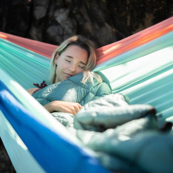 • Studio shot featuring Nakie's hammock, puffy blanket, and towel, showcasing the brand's range of eco-friendly outdoor essentials for relaxation and comfort