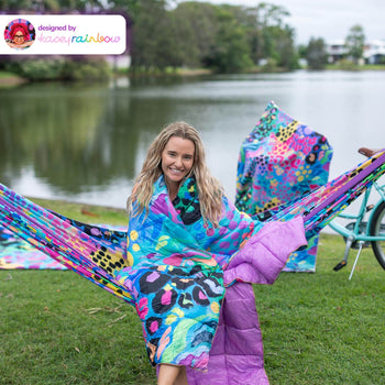 • Studio shot featuring Nakie's innovative towel hammock beach towel, combining the comfort of a towel with the relaxation of a hammock for ultimate beach lounging