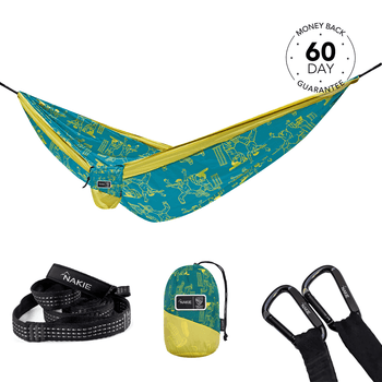 Just yourself and two trees! Each Nakie hammock comes standard with no knot straps and carabiners for an easy no fuss set up. You do not need any extra equipment. Setting up your own hammock is very easy. Our current record is 27 seconds! With our no fuss straps and carabiners you won’t need to tie a single knot. Setting up a Nakie hammock is straightforward. Here’s how to do it in a few simple steps: - Find Two Anchor Points: Look for two sturdy trees (or posts) about 10-15 feet apart. Ensure they’re healthy and can support your weight—trees should be at least 6 inches in diameter to avoid damage or risk - Loop the Straps: Take the provided tree straps and wrap each one around a tree at about head height (around 5-6 feet up). Feed the end of the strap through its own loop and pull tight to secure it. Nakie hammocks come with reinforced straps designed to be tree-friendly, so they won’t harm the bark. - Attach the Hammock: Clip each end of the hammock to the straps using the included carabiner clips. Nakie straps have multiple loops, so you can adjust the tension by choosing different loops—start with one in the middle. - Test and Adjust: Sit in the hammock to check the height and comfort. The middle should hang about hip level, with the ends at head height, to create a cozy curve. If it’s too low or tight, adjust the clips on the straps or raise/lower the straps on the trees.