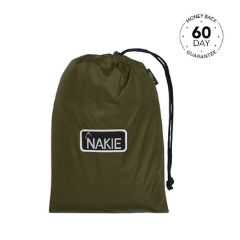 • Man lounging comfortably in a Nakie hammock with an integrated bug net and tarp, providing protection from insects and weather elements during outdoor adventures Studio shot presenting the Nakie combo set, featuring a hammock, bug net, and tarp, showcasing its all-in-one solution for outdoor comfort and protection, ideal for camping and backpacking adventures