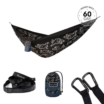 NRL Penrith Panthers x Nakie Double HammockDimensions: 3m × 1.8mWeight rating: 225kgWeight: 600g 2 × Hammock StrapsLength: 2.3m per strapWeight ...