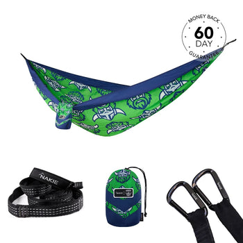 NRL New Zealand Warriors x Nakie Double HammockDimensions: 3m × 1.8mWeight rating: 225kgWeight: 600g 2 × Hammock StrapsLength: 2.3m per strapWei...