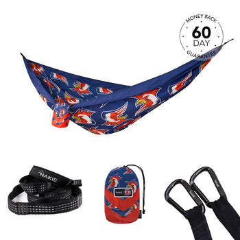 NRL Sydney Roosters x Nakie Double HammockDimensions: 3m × 1.8mWeight rating: 225kgWeight: 600g 2 × Hammock StrapsLength: 2.3m per strapWeight r...