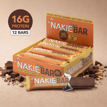 Nakie Protein Bars are made from clean, natural ingredients including tapioca, peanuts, whey protein, pea protein, peanut butter, pea crisps, Himalayan salt, collagen, natural flavour, and monk fruit. High in protein, gluten-free, and made in Australia with no fillers or seed oils.